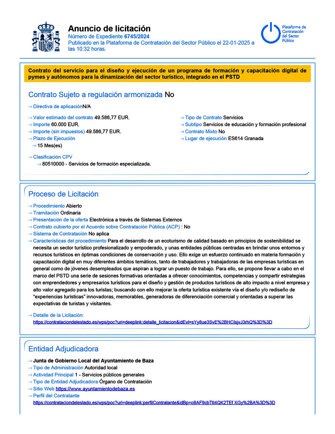 El presupuesto base de licitación asciende a 70.000 euros (IVA incluido), y las empresas interesadas podrán presentar sus ofertas hasta el 5 de febrero de 2025, disponiéndose de más detalles sobre el procedimiento en el portal oficial de contratación pública. Igualmente, se puede acceder al detalle del procedimiento desde el anterior enlace.