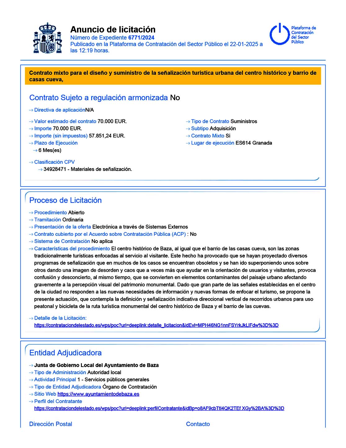 Una de las licitaciones, Señalización turística para el centro histórico y el barrio de las casas cueva, busca renovar y organizar los sistemas actuales, muchos de los cuales están obsoletos o superpuestos, lo que genera confusión entre los visitantes y afecta negativamente la percepción visual del patrimonio monumental.