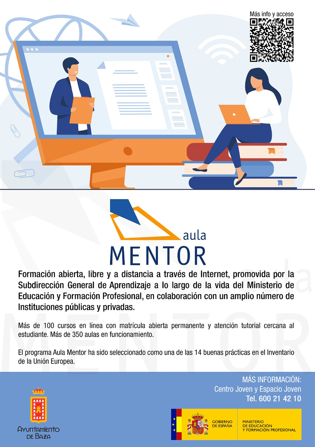 El Centro Joven de Baza, sede para dudas y uso de las instalaciones de personas interesadas en acceder al programa de formación online “Aula Mentor”. Aula Mentor es un programa de formación online no reglada, flexible y con tutorización personalizada, dirigido a personas adultas mayores de 18 años. A través de él se puede acceder a más de 170 cursos de distintas ramas, siempre de modo online.