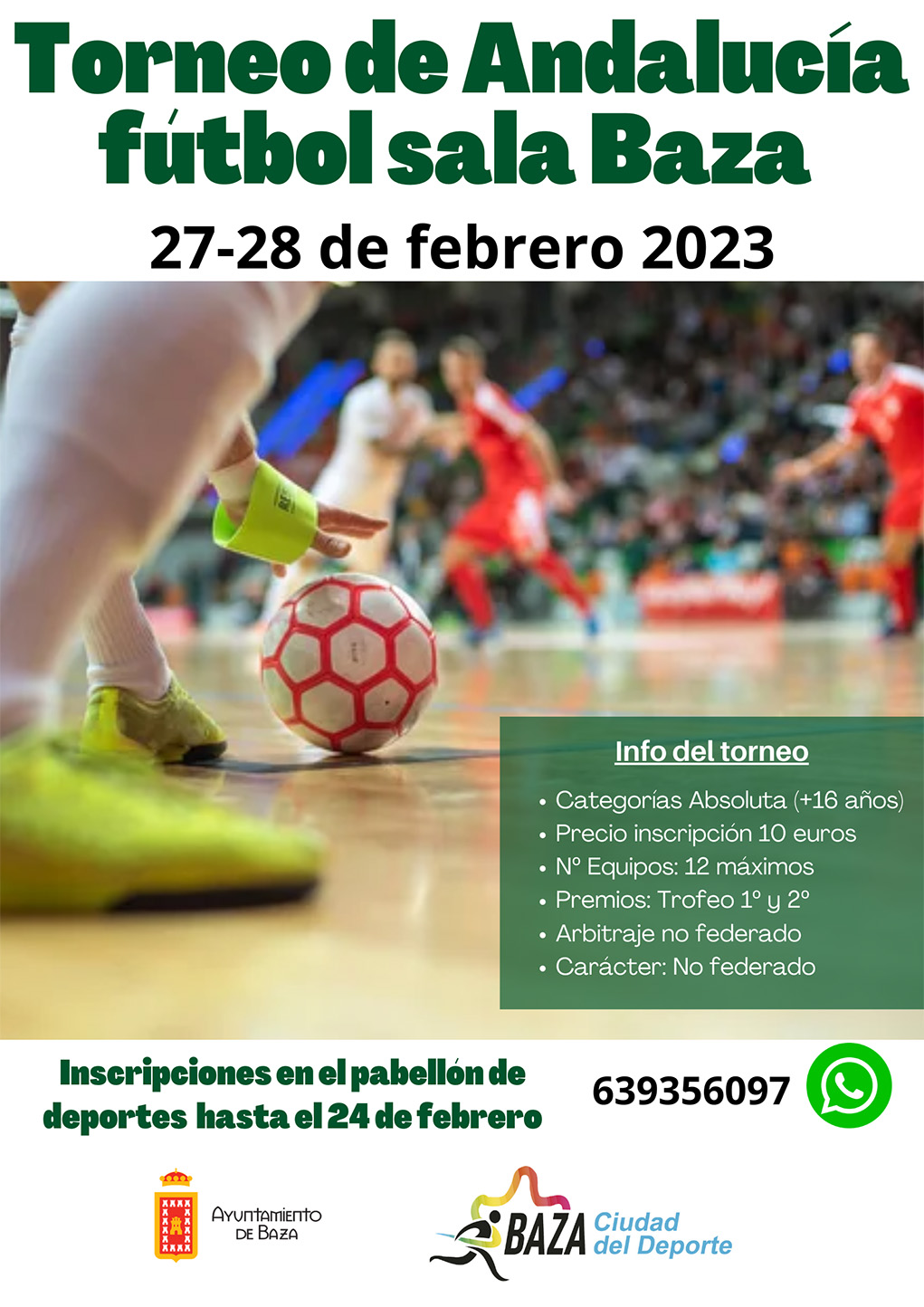 Baza tendrá su Torneo de Andalucía de Fútbol Sala para celebrar el 28 de febrero. Con motivo del 28 de febrero, Día de Andalucía, se ha programado en nuestra ciudad el Torneo de Andalucía de Fútbol Sala que se celebrará en categoría absoluta y en la que podrán participar jugadores mayores de 16 años.