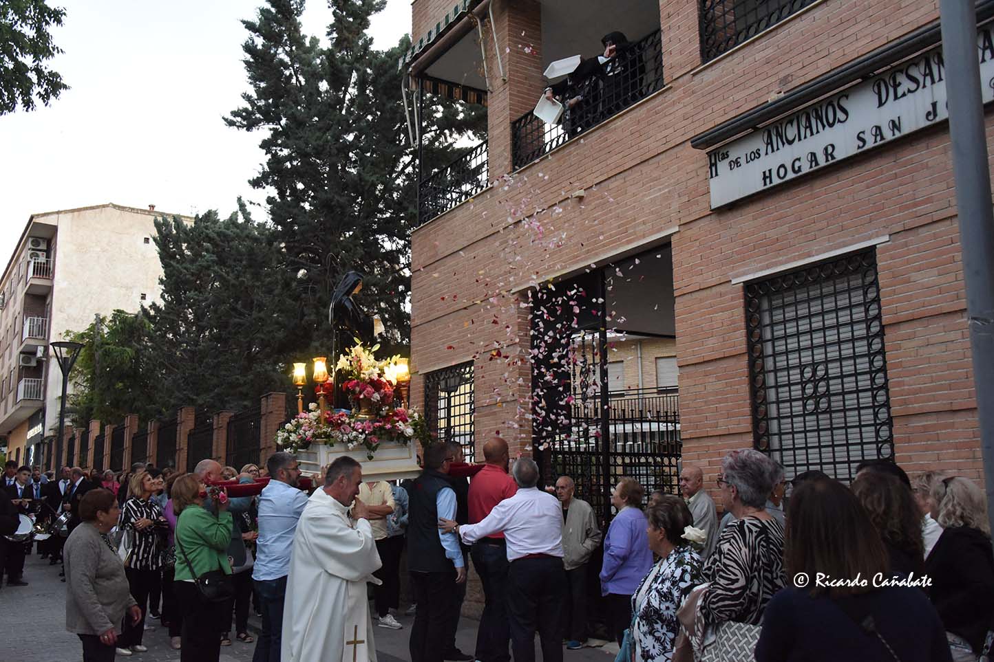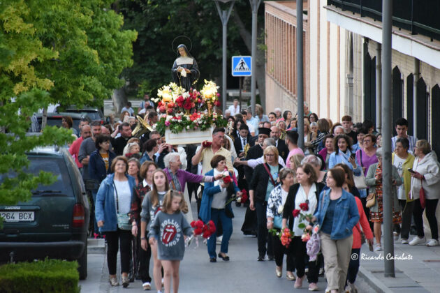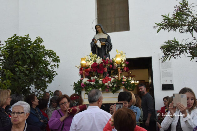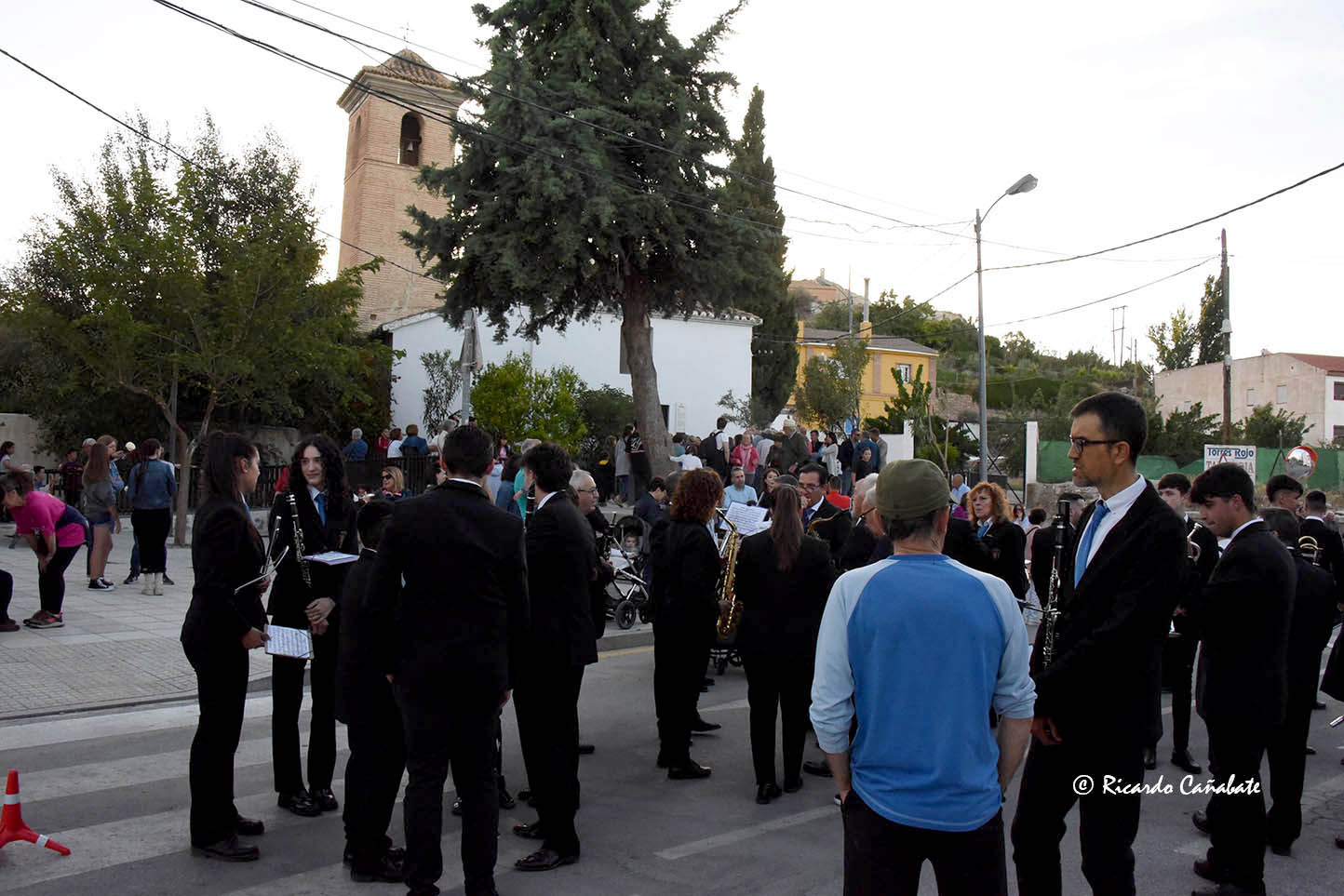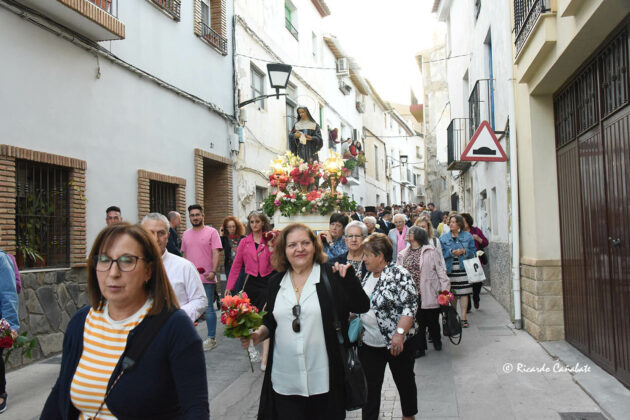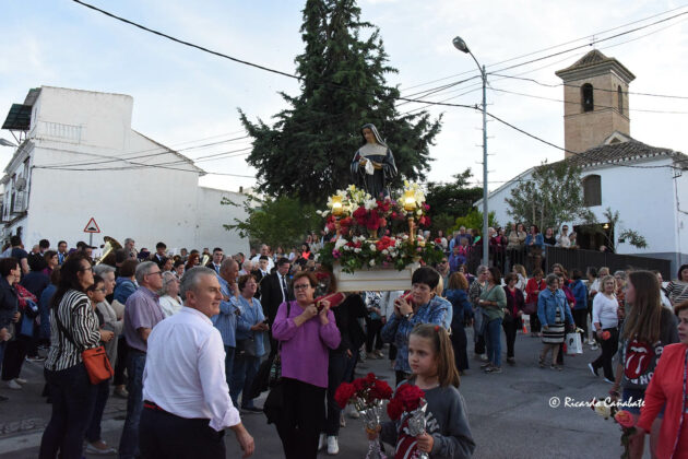 Una placeta que estaba muy concurrida y que, tras la bendición de las flores, con gran presencia de las simbólicas rosas, recibía a Santa Rita sobre unas andas bellamente adornadas y sobre los hombros de un buen grupo de mujeres que se hicieron cargo de los primeros relevos, mientras la procesión cruzaba la Ronda de Baza y se adentraba por una calle del Chorrillo que se vio ocupada, de punta a punta, por los fieles que iban tras la imagen, mientras sonaban los acordes de la asociación Banda Municipal de Música de Baza, que recibieron a la imagen con los sones del himno nacional.