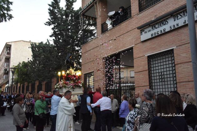 El recorrido continuaba por las calles Humilladero y Santa Teresa de Jornet, para girar por la Avda. de Andalucía e ir a detenerse ante la puerta del Hogar San José, de las Hermanitas, donde se ofreció una petalada a la conocida en España como “Santa de los imposibles y abogada de sus causas”, tras lo que la comitiva cruzaba la Plaza de las Eras para dirigirse de nuevo hasta su ermita, teniendo que variar su acostumbrado itinerario por los problemas surgidos en la vivienda que ardía hace unos días en la calle Cáliz, por la que se solía hacer el camino de retorno.