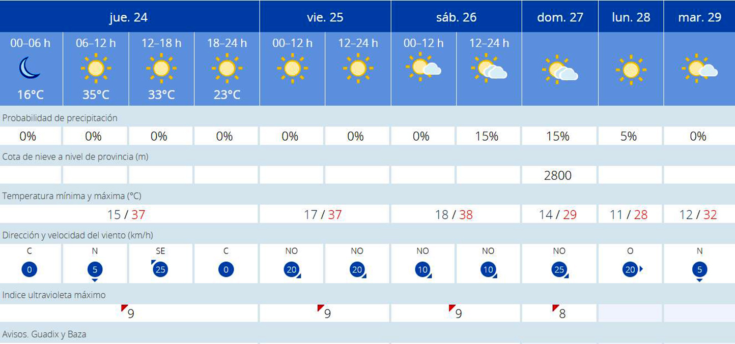 Por fin llega un respiro en las temperaturas de este verano en nuestra ciudad, con un descenso de once grados en la temperatura máxima. Un respiro que llegará el próximo domingo, día en el que la temperatura máxima en Baza alcanzará los 29ºC, tras una jornada previa en la que el termómetro alcanzará los 38ºC, que es la temperatura que marcará el valor superior en los próximos días.