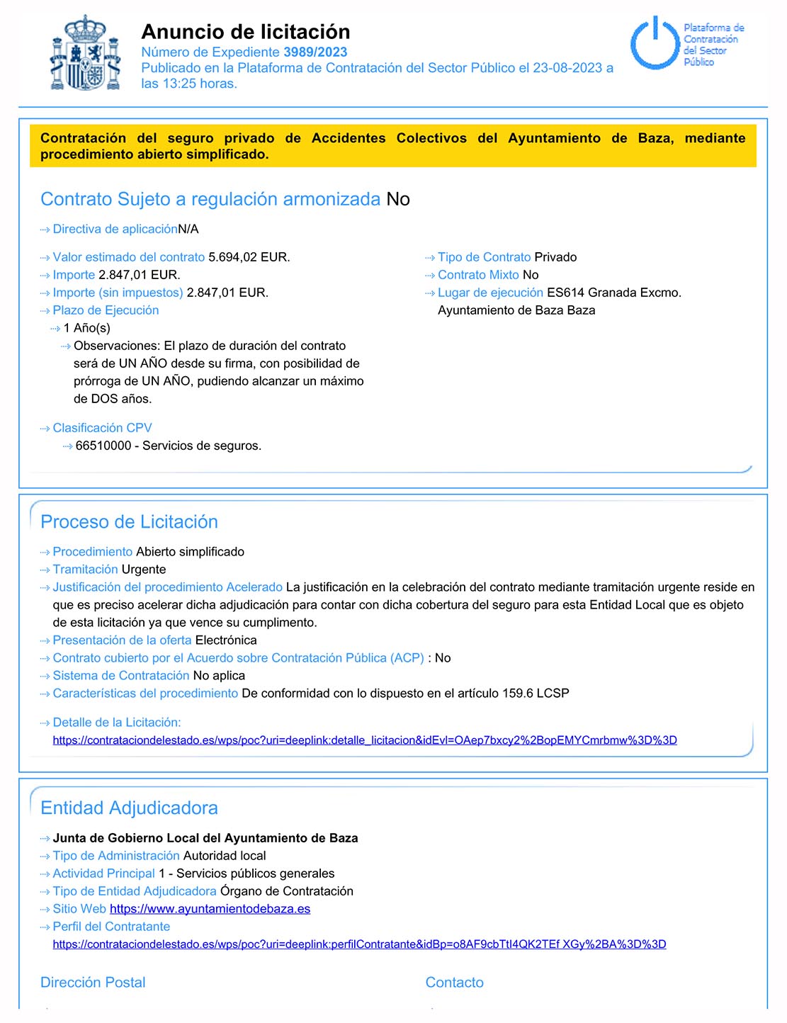 El Ayuntamiento de Baza anuncia las licitaciones del seguro de accidentes colectivos y el servicio de vigilancia y seguridad privada en las dependencias municipales. Se ha procedido a la publicación del anuncio de licitación del seguro privado de Accidentes Colectivos del Ayuntamiento de Baza, mediante procedimiento abierto simplificado, para el que se cuenta con un plazo de presentación de ofertas que finalizará el próximo día 06/09/2023 y a cuyos detalles se puede acceder a través del anterior enlace.