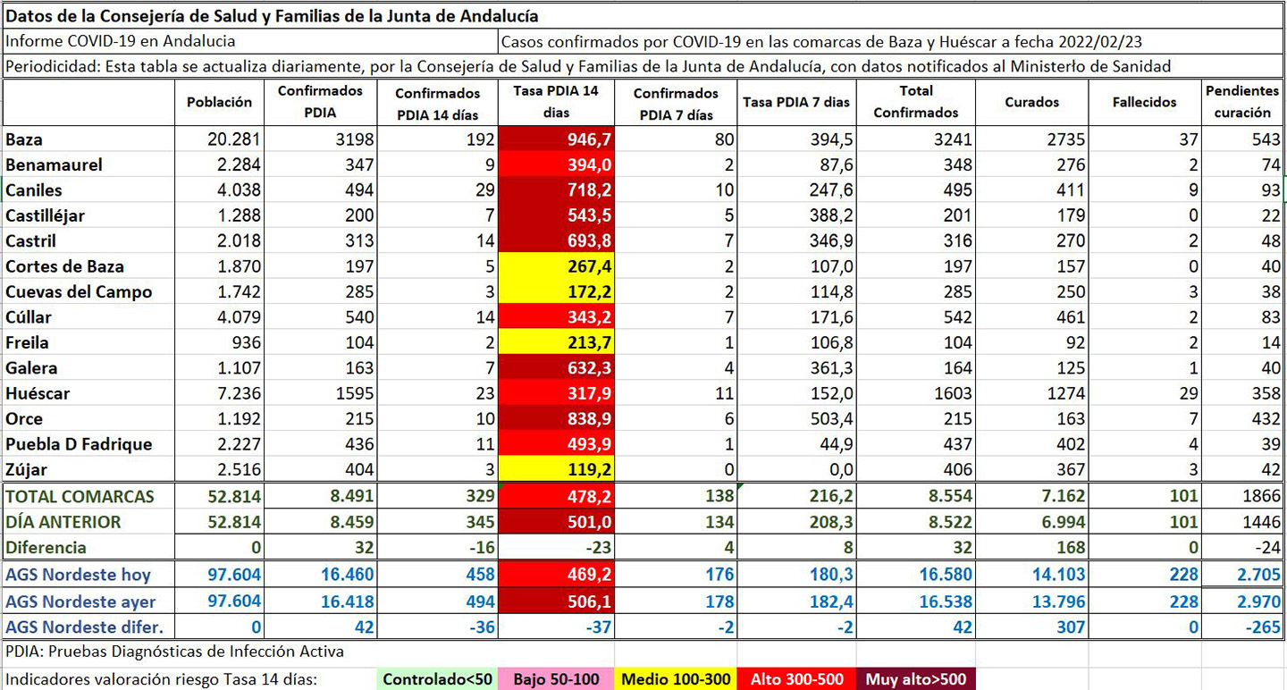 A nivel del AGS Nordeste de Granada, bajada de 36 confirmados PDIA a 14 días y de otros dos a 7 días, quedando las tasas de incidencia en 469,2 y en 180,3, lo que viene a ser la primera vez que tanto las comarcas de Baza y Huéscar como el AGS Nordeste bajan la tasa a 14 días del medio millar. Destacar también los 397 curados en el AGS que rebajan en 265 la cifra total del AGS, quedando ahora en 2705 las personas pendientes de curación.