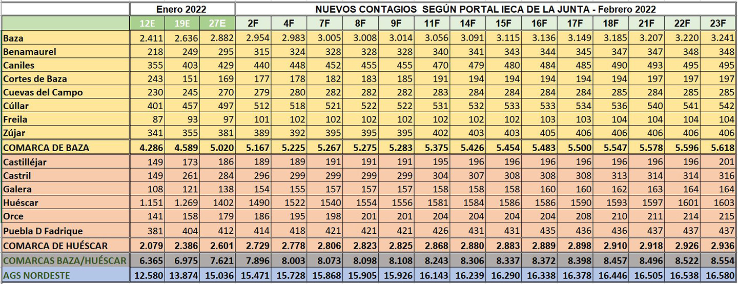 21 casos nuevos añadía la ciudad bastetana, mientras que los 13 municipios restantes de las comarcas de Baza y Huéscar sumaban 11 casos más, a pesar de que solo Castilléjar sumaba 5 más con los que daba también un notable paso atrás que llevaba a este municipio del nivel sanitario “Medio” al “Muy alto”, precisamente cuando estaba a punto de llegar a los cero casos totales. Del resto de municipios, 2 sumaron Castril y Huéscar, mientras que Cúllar y Orce añadían un caso más entre sus habitantes y el resto de localidades permanecían sin ningún caso de coronavirus más que añadir. Fue el caso de Benamaurel, Caniles, Cortes de Baza, Cuevas del Campo, Freila, Galera, Puebla de don Fadrique y Zújar, circunstancias que posibilitaron le mejora de Benamaurel y Puebla de don Fadrique, al pasar del nivel “medio” al “Muy alto, a la par que Cortes de Baza bajaba al nivel medio.