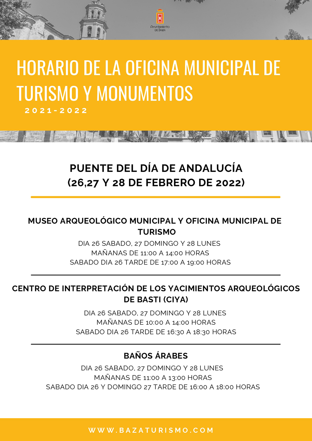 - Centro de Interpretación de los Yacimientos Arqueológicos de Basti, CIYA: El sábado 26, domingo 27 y lunes 28 abrirá por las mañanas de 10:00 a 14:00 horas. Además, el sábado 26 abrirá por la tarde, de 16:30 a 18:30 horas.