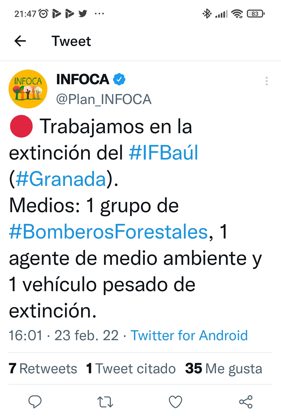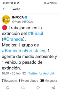 También el Infoca trabajaba ayer en la extinción de un incendio en Baúl, en la comarca de Baza. En la tarde de ayer recibíamos un aviso de la red Twitter, procedente del Infoca, por el que se nos hacía sabedores de la actuación que estaban llevando a cabo, dentro del municipio bastetano y, más concretamente, en su anejo del Baúl.
