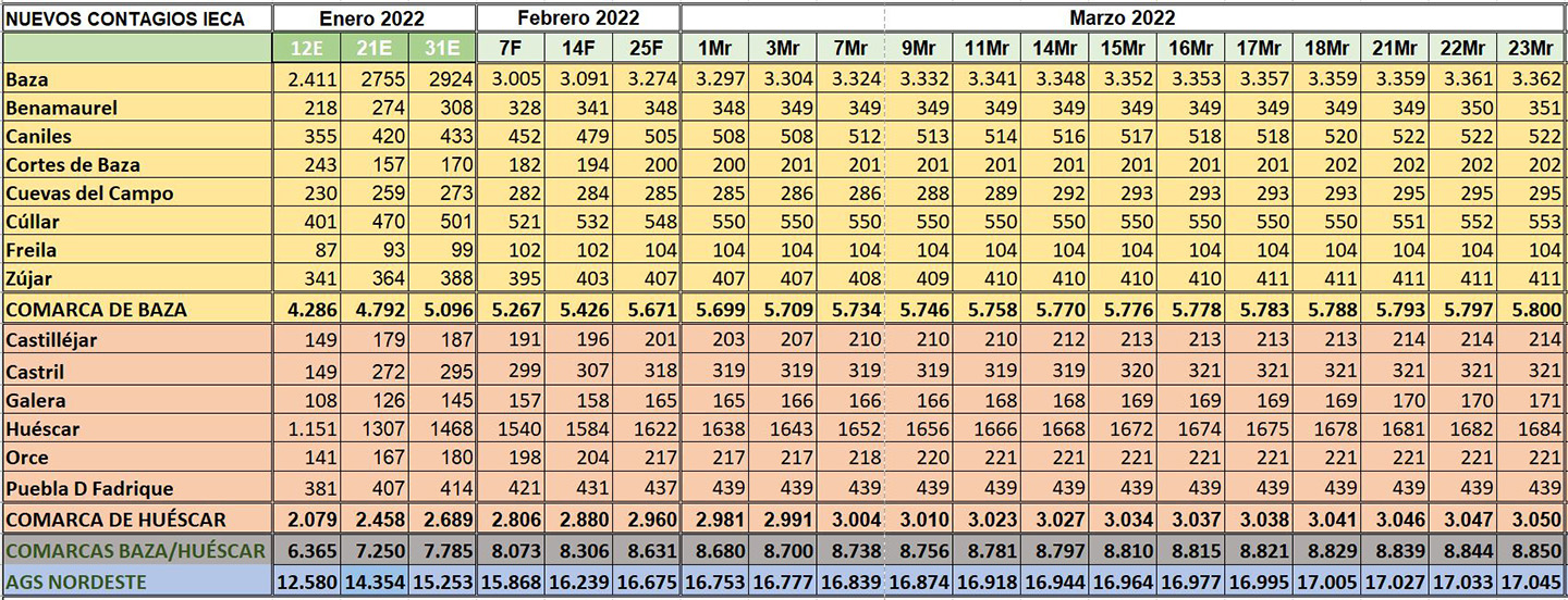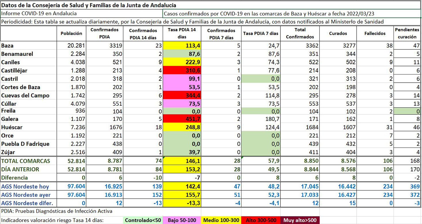 Cifras estas que motivaron un descenso de 7 casos en la tasa de incidencia a 14 días, que pasaba a ser de 146,1, pero un aumento de 8 puntos en la tasa a 7 días, que pasaba a ser de 57,9 casos por 100.000 habitantes, a pesar de que son cinco los municipios que tienen esa tasa a cero: Freila, Zújar, Castril, Huéscar y Orce, municipio este último que colocaba también a cero su tasa a 14 días. Además, Huéscar mejoraba su nivel sanitario, al pasar de “Alto” a “Medio”, mientras que lo empeoraban Benamaurel y Cúllar, al pasar de “Controlado” a “Bajo”.