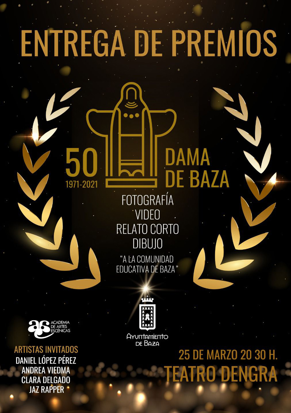 Mañana viernes se celebra la Gran gala de entrega de los Premios Educativos organizados con motivo del 50 Aniversario del Descubrimiento de la Dama de Baza. El Teatro Dengra será este viernes 25 de marzo el escenario para el acto de entrega de los Premios Educativos de dibujo, micro-vídeo, fotografía y relato corto convocados con motivo del 50 Aniversario del Descubrimiento de la Dama de Baza. Un gran evento en el que se quiere reconocer el talento tanto de los ganadores en los diferentes concursos como de todos los participantes. El acto dará comienzo a las ocho y media de la tarde y cuenta para su desarrollo con la participación de la Academia de Artes Escénicas. Como artistas invitados actuarán Daniel López Pérez, Andrea Viedma, Clara Delgado y Jaz Rapper.