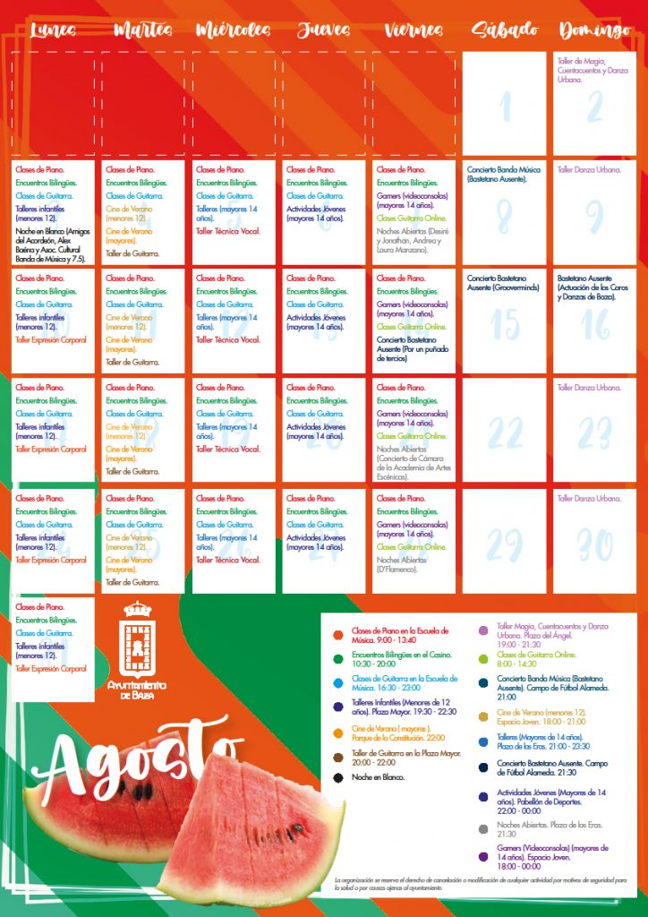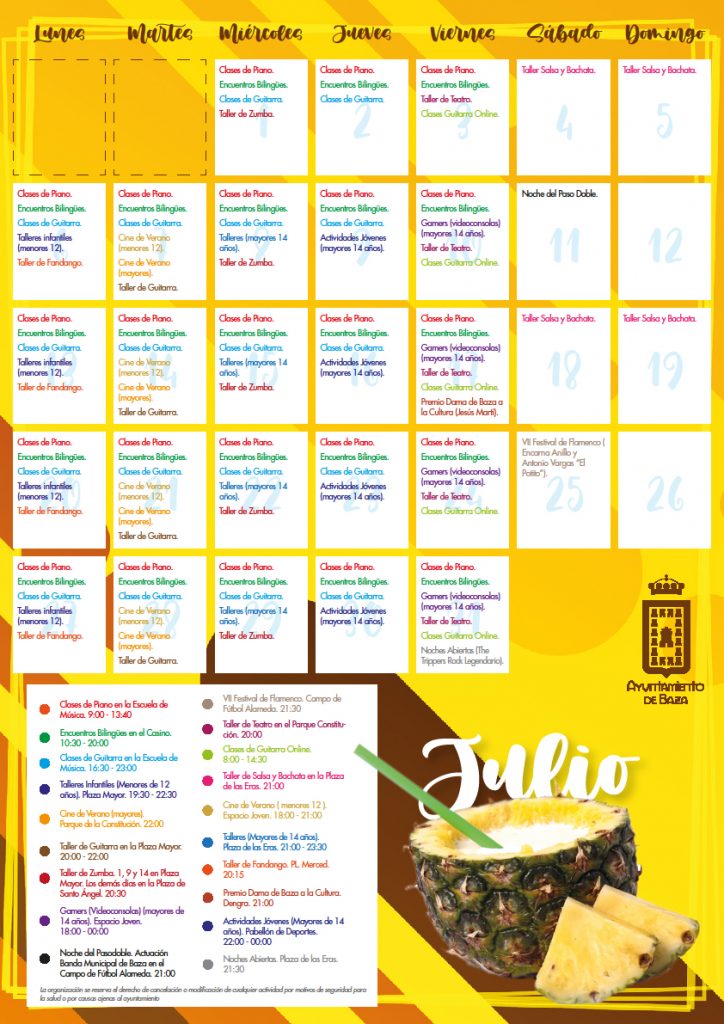 Principales actividades que se llevarán a cabo en esta programación veraniega para Baza. La programación contempla actividades clásicas en las noches de verano en Baza como las Noches Abiertas, la Noche en Blanco en colaboración con la asociación de comercio, el Bastetano Ausente en agosto, los conciertos de la Banda Municipal de Música, la entrega del Premio Dama de Baza a la Cultura, el festival de flamenco, el festival de teatro infantil y las proyecciones de cine en el Parque de la Constitución. Con otros nuevos como los talleres de zumba, teatro, salsa, fandango, guitarra, técnica vocal, expresión corporal, danza urbana, pintura e talleres infantiles, clases de piano y de guitarra on line. Otra de las novedades son los encuentros bilingües, en colaboración con un establecimiento y la comunidad inglesa residente en Baza, para las personas que quieran mejorar su conversación en habla inglesa.