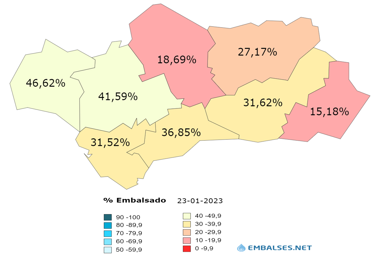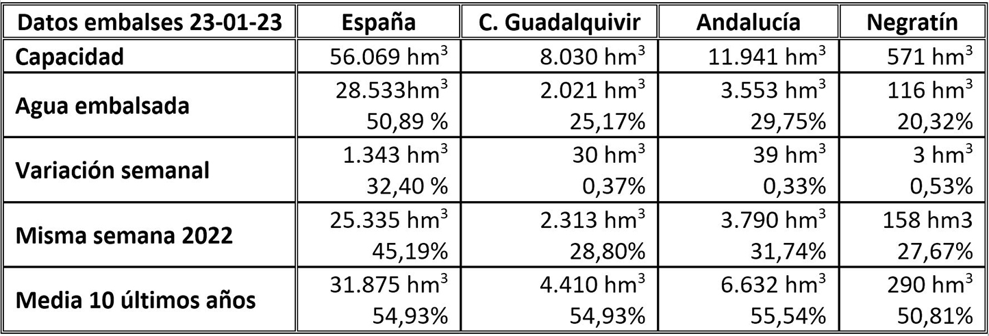 La reserva hídrica española se encuentra al 50,9 por ciento de su capacidad y almacena ya 28.533 hm3, cuando el Negratín supera por fin el 20% al sumar 3 hm3 en la última semana. El pasado martes 23 de enero se daba a conocer la habitual información cobre el estado de los embalses españoles, los cuales cuentan con una reserva hídrica de algo más de ocho mil hectómetros cúbicos, que supone estar al 50,89% de su capacidad, mientras el Negratín ha superado, por fin, el 20% y se sitúa al 20,32%, tras aumentar 3 hm3 esta última semana.