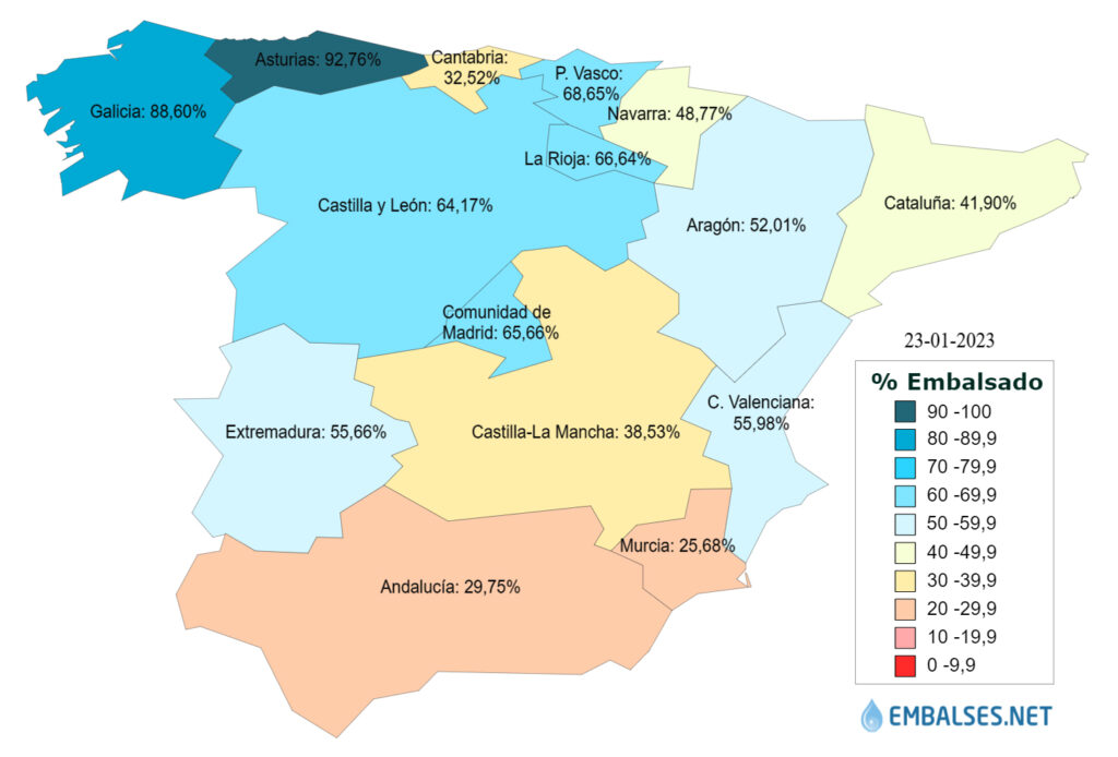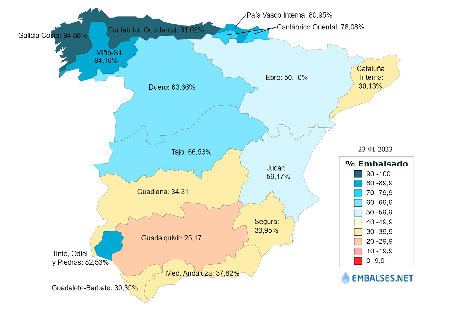 En cuanto a la reserva por ámbitos, la situación de mayor a menor cantidad de agua almacenada en las diferentes cuencas, es la siguiente: Galicia Costa se encuentra al 94,9%, Cantábrico Occidental al 91%, Miño-Sil al 84,2%, Tinto, Odiel y Piedras al 82,5%, Cuencas internas del País Vasco al 81%, Cantábrico Oriental al 78,1%, Tajo al 66,5%, Duero al 63,7%, Júcar al 59,2%, Ebro al 50,1%, Cuenca Mediterránea Andaluza al 37,8%, Segura al 33,9%, Guadiana al 33,3%, Guadalete-Barbate al 30,3%, Cuencas internas de Cataluña al 30,1% y la del Guadalquivir al 25,2%.