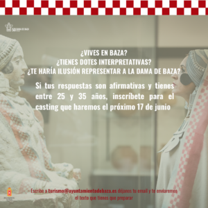 El Ayuntamiento de Baza convoca un casting para encontrar relevo generacional a la persona encargada de representar a la Dama de Baza. El Ayuntamiento de Baza ha iniciado un proceso para encontrar relevo generacional a la persona encargada de representar a la Dama de Baza en eventos de carácter público.