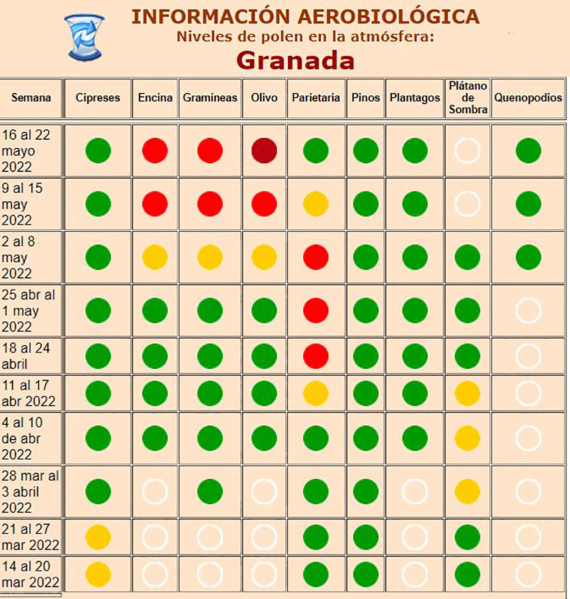 Estos datos sobre los niveles de polen en la atmósfera son de conocimiento aconsejable para las personas alérgicas y se dan a conocer en Granada desde 1992, gracias a la estación de la Red Española de Aerobiología del Departamento de Botánica de la Facultad de Ciencias de la Universidad de Granada, desde donde se proporciona información semanal de los niveles de polen de la atmósfera siguiendo la metodología estandarizada y a través de esta página web, en la que se informa sobre los niveles de polen actuales y una predicción para los siguientes días, así como calendarios polínicos, descripción de plantas que causan alergia y otras noticias de interés aerobiológico, que también aparecen en sus perfiles en redes sociales como Twitter o Instagram, que se pueden encontrar a través de la dirección @botanicaugr.