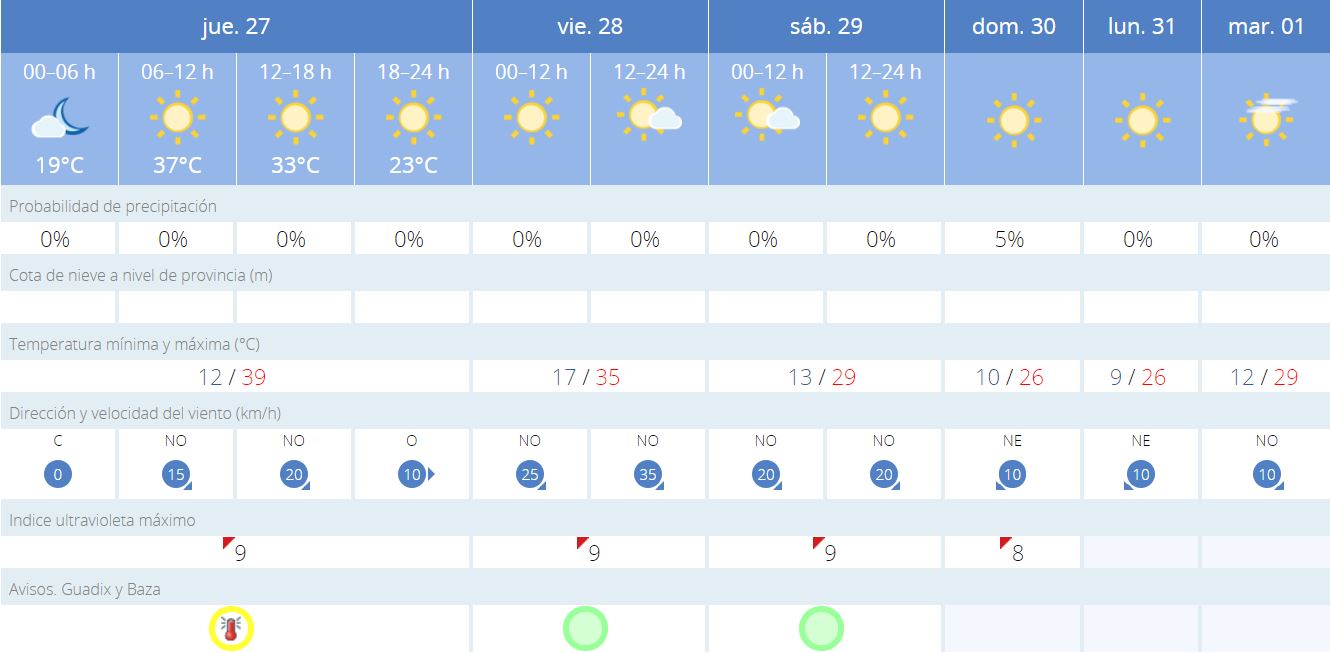 Una zona en la que hoy está prevista una temperatura de hasta 39ºC, si bien la mínima sufrirá , en un día soleado y sin nubes, un desplome que se irá hasta los 12ºC y que estará acompañado por la presencia de la habitual brisa veraniega en nuestra ciudad.