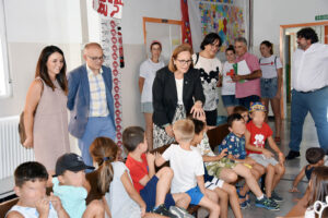 Acompañada por el alcalde de la ciudad, Pedro J. Ramos, por la concejala de Bienestar Social, Priscila Martínez, y por la delegada de Educación, la bastetana Mª José Martín, la delegada de Inclusión Social recorrió las dependencias escolares que están utilizando los niños que acuden a esta iniciativa, que cumple su vigesimonovena edición. Pudieron hablar con ellos, conocer sus comentarios, lo que más les gusta de la Escuela, así como con algunas monitoras, que explicaron a la representante del gobierno andaluz las tareas y actividades que se desarrollan con normalidad. En el encuentro estuvieron también presentes varios representantes de la asamblea local de Cruz Roja, que son los que se encargan de la asistencia alimentaria a varios alumnos de esta escuela estival.