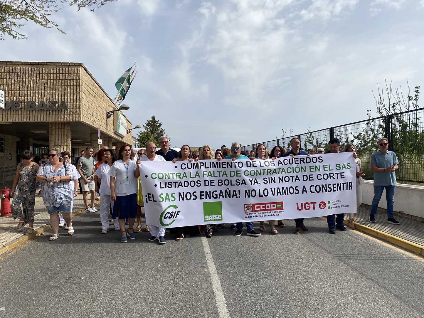 Las organizaciones sindicales cifraron en un 75% el seguimiento de la huelga en los centros granadinos del SAS y se hicieron presentes también en Baza. Los sindicatos SATSE, CSIF, CCOO y UGT han cifrado en un 75 % el seguimiento global de la huelga convocada este miércoles 26 de junio en la Atención Primaria, superando el 90 % en los hospitales de la provincia de Granada. La jornada de huelga ha consistido en un paro entre las 08.00 y las 11.00 horas en todos los centros del Sistema Sanitario Público Andaluz, que afectó también a nuestra ciudad, con la concentración realizada ante el Hospital Comarcal, de la que no se nos han facilitado datos numéricos, pero que contó con una notable asistencia e incluyó la participación del PSOE bastetano