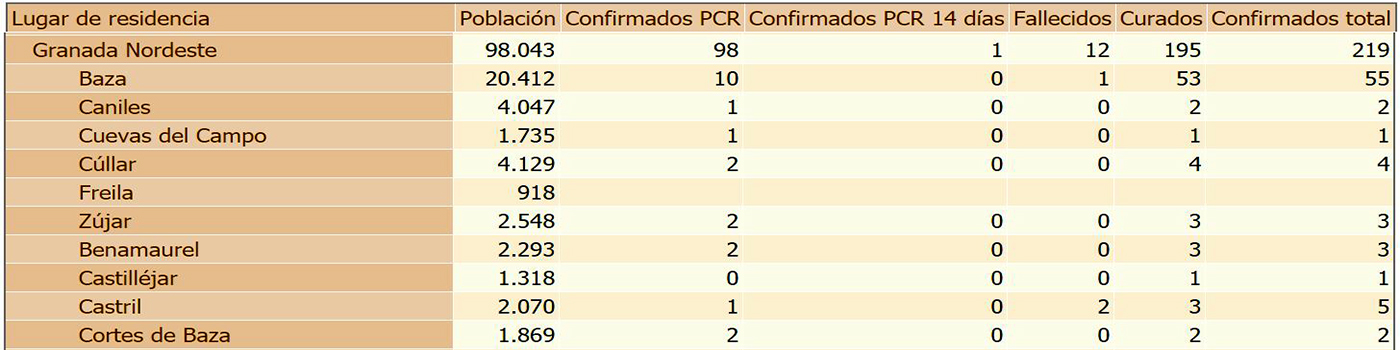 Se mantiene la situación en Baza, pero Granada suma otras dos muertes y registra otros once nuevos casos. Datos de la Junta de Andalucía hablan de una situación estable en el Área de gestión Sanitaria Noreste de Granda, de los que ofrecemos los referidos a las poblaciones de las comarcas de Baza y Huéscar: