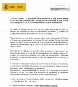 El primero de esos documentos, fechado el 8 de mayo, determinó que la provincia se quedara en la fase 0 por la «elevada» tasa de incidencia de COVID-19 que habían registrado las dos semanas anteriores los distritos más afectados por la pandemia, Granada y Granada-Metropolitano, y no poder garantizar el control de la movilidad entre estos distritos y los que tenían menor impacto.