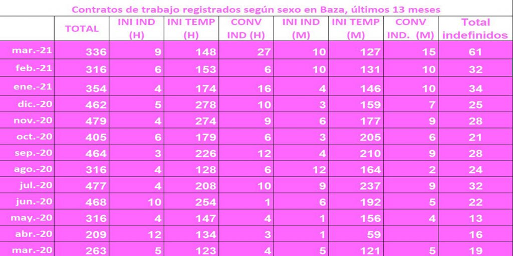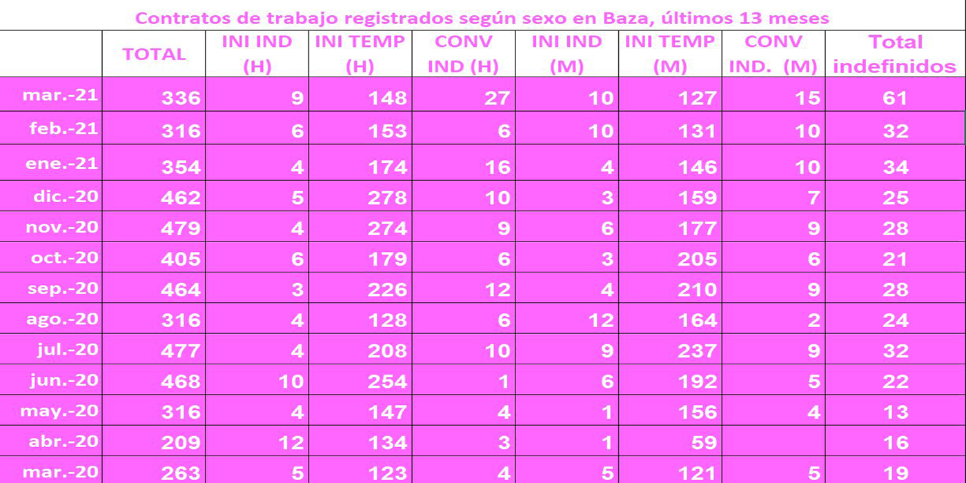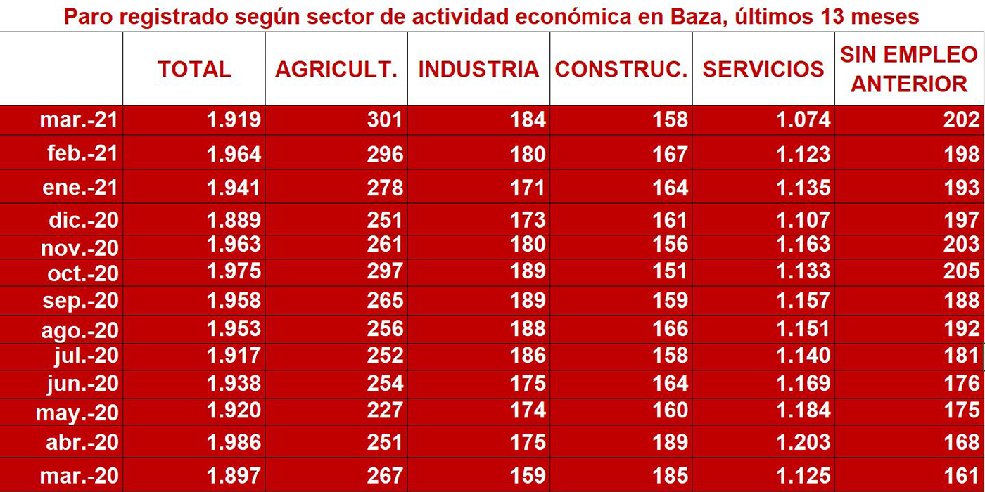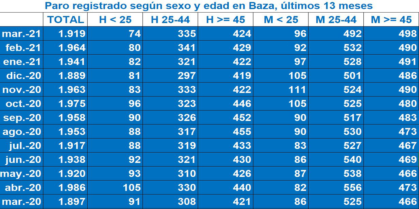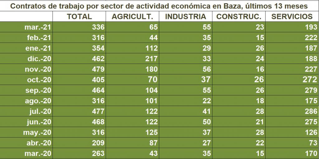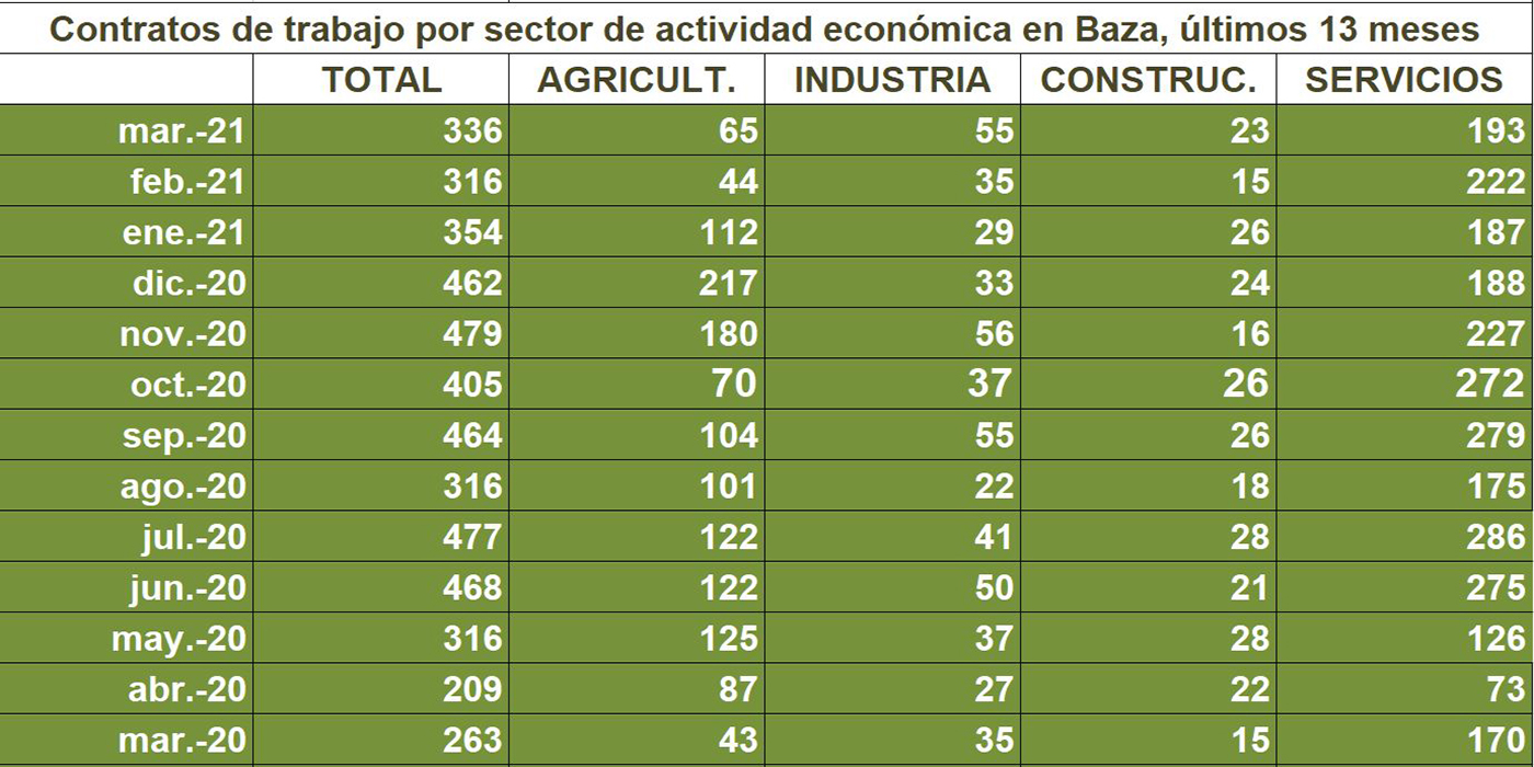 Permanecen prácticamente inalterables las cifras sobre empleo en Baza, afectadas también por la pandemia, aunque reflejan un pequeño descenso en la cifra de desempleo. Las medidas adoptadas en el ámbito laboral, sobre todo las relacionadas con los ERTEs y la paralización de despidos, como aspectos más destacados, hacen que las cifras pierdan parte de su valor real al tratarse de una situación que no se desarrolla dentro de la normalidad acostumbrada.