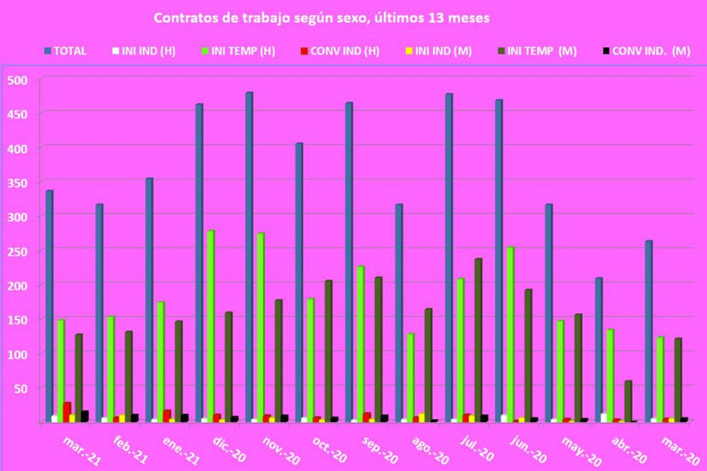 En cuanto a los contratos realizados, se firmaron 20 más que en el mes de febrero, creciendo en los sectores de la agricultura, industria y construcción, mientras que disminuyeron los del sector de servicios. Destacar también la firma que es casi récord de 61 contratos indefinidos realizados en este periodo, de ellos 36 hombres y 25 mujeres, y 19 que se inician directamente como contratos indefinidos, mientras que el resto eran contratos temporales ya existentes que cambiaron su modalidad a indefinidos.