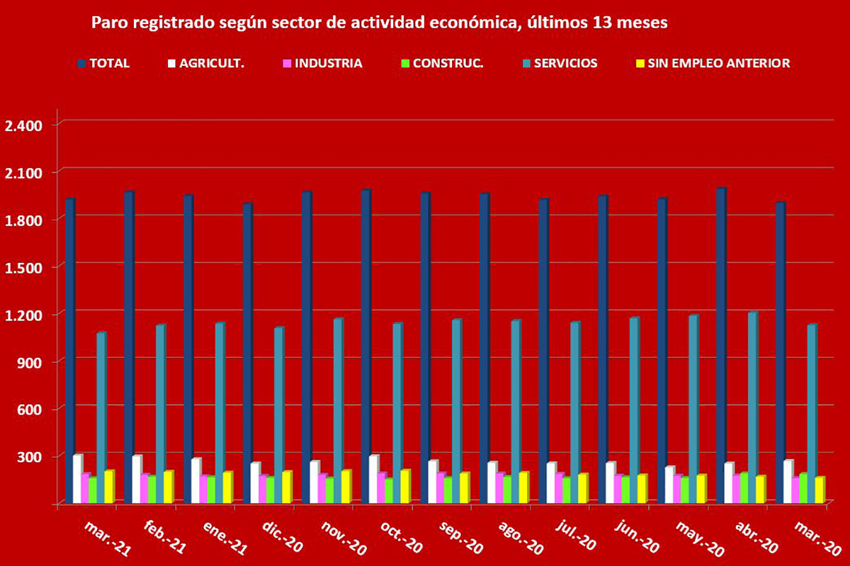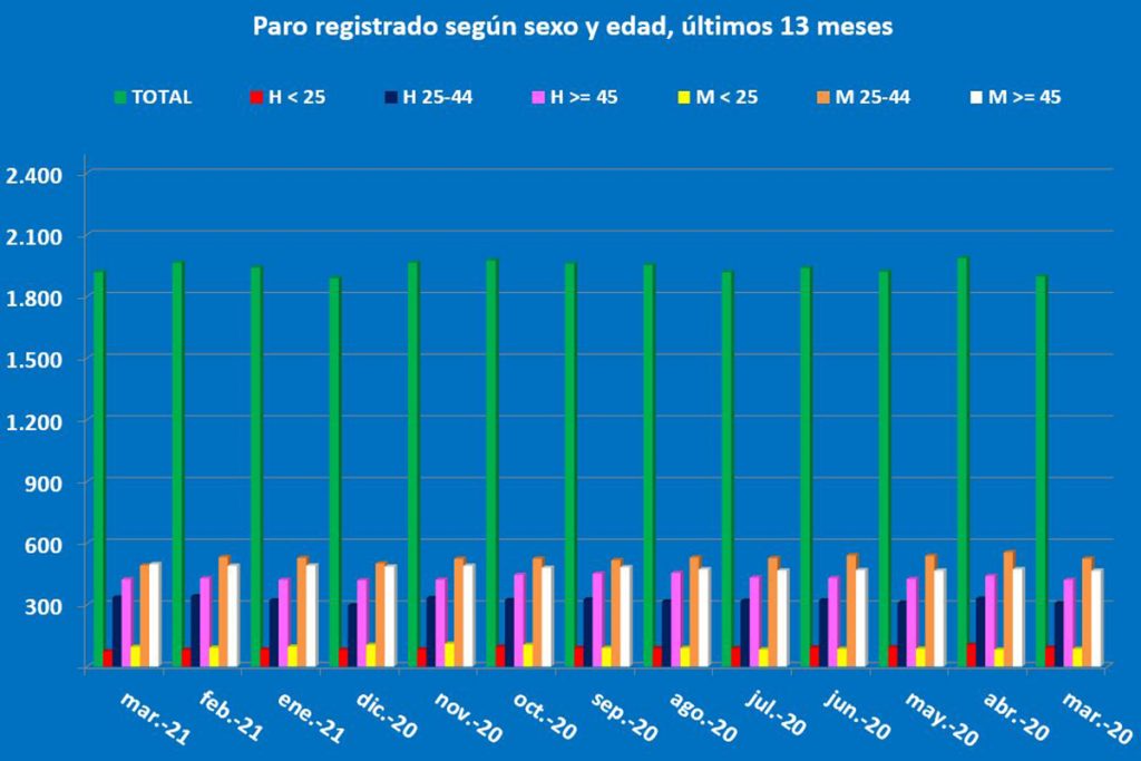 Aun así no hay que perder de vista lo que va ocurriendo, sin olvidar nunca que cada uno de los desempleados es un drama personal y un motivo para impulsar el empleo y la ocupación al máximo, y eso nos hace ver una situación en la que al finalizar el mes de marzo se producía un descenso en el número de parados en nuestra ciudad de 45 personas, destacando que se han visto favorecidos de ello todos los grupos de edad en el caso de los hombres, pero solo el del tramo de 25 a 44 años en el caso de las mujeres, mientras las menores de 25 años y las mayores de 45 han visto crecer la cifra de desempleadas. Por sectores, el empleo mejoró en la construcción y en el sector de servicios, pero dio un pequeño paso atrás en la agricultura, la industria y el grupo de personas sin empleo anterior.