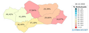 A nivel de la Comunidad de Andalucía, hay embalsados 3.443 hm3 que suponen un 28.83% de su capacidad total que es de 11.941 hm3 y supone una variación semanal de 55 hm3, equivalentes al 0.46%. En la misma semana del 2021, se almacenaban 3.746 hm3, que son un 31.37% del total y respecto a la media de la misma semana en los diez últimos años, aún estamos lejos de alcanzar el agua almacenada en ese tiempo que era 6.476 hm3, que suponían un 54.24% de su capacidad total