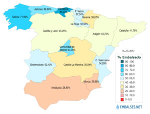Por lo que hace referencia a la reserva por ámbitos es la siguiente: Galicia Costa está al 85,7%, Tinto, Odiel y Piedras al 83,8%, Cantábrico Oriental al 68,5%, Cantábrico Occidental al 65,9%, Miño-Sil al 64,7%, Cuencas internas del País Vasco al 61,9%, Tajo al 61,4%, Júcar al 56,6%, Ebro al 47,0%, Duero al 44,8%, Cuenca Mediterránea Andaluza al 37,9%, Segura al 33,9%, Guadiana al 32,6%, Cuencas internas de Cataluña al 31,8%, Guadalete-Barbate al 29,2% y Guadalquivir al 24,0%.