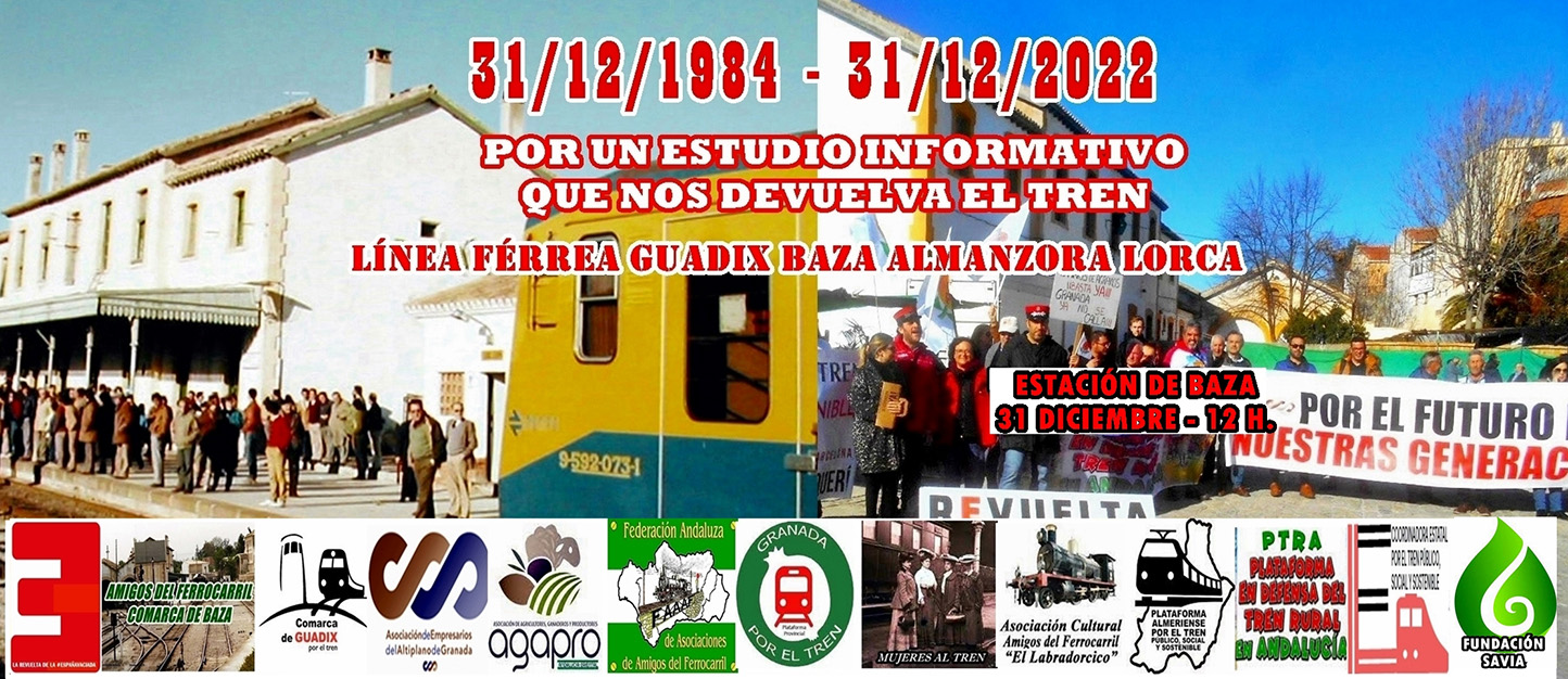 38 años lleva la ciudadanía de las comarcas del sureste peninsular reclamando el tren, los mismos años que lleva injustamente cerrada la línea férrea que las vertebraba. Bajo el lema «Por un Estudio Informativo que nos devuelva el tren», la Asociación Amigos del Ferrocarril Comarca de Baza y la plataforma Comarca de Guadix por el Tren, en colaboración con la Asociación de Empresarios Altiplano de Granada, la asociación agroganadera AGAPRO y la movilización social La Revuelta de la España Vaciada, convocan un acto reivindicativo por la reapertura de la línea férrea Guadix-Baza-Almanzora-Lorca y en defensa del tren público social sostenible. Tendrá lugar en la antigua estación de Baza este 31 de Diciembre a las doce del mediodía.