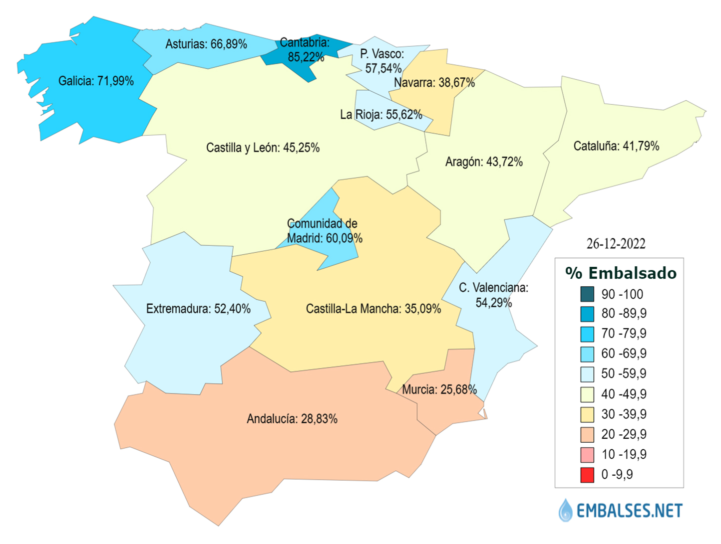 Por lo que hace referencia a la reserva por ámbitos es la siguiente: Galicia Costa está al 85,7%, Tinto, Odiel y Piedras al 83,8%, Cantábrico Oriental al 68,5%, Cantábrico Occidental al 65,9%, Miño-Sil al 64,7%, Cuencas internas del País Vasco al 61,9%, Tajo al 61,4%, Júcar al 56,6%, Ebro al 47,0%, Duero al 44,8%, Cuenca Mediterránea Andaluza al 37,9%, Segura al 33,9%, Guadiana al 32,6%, Cuencas internas de Cataluña al 31,8%, Guadalete-Barbate al 29,2% y Guadalquivir al 24,0%.