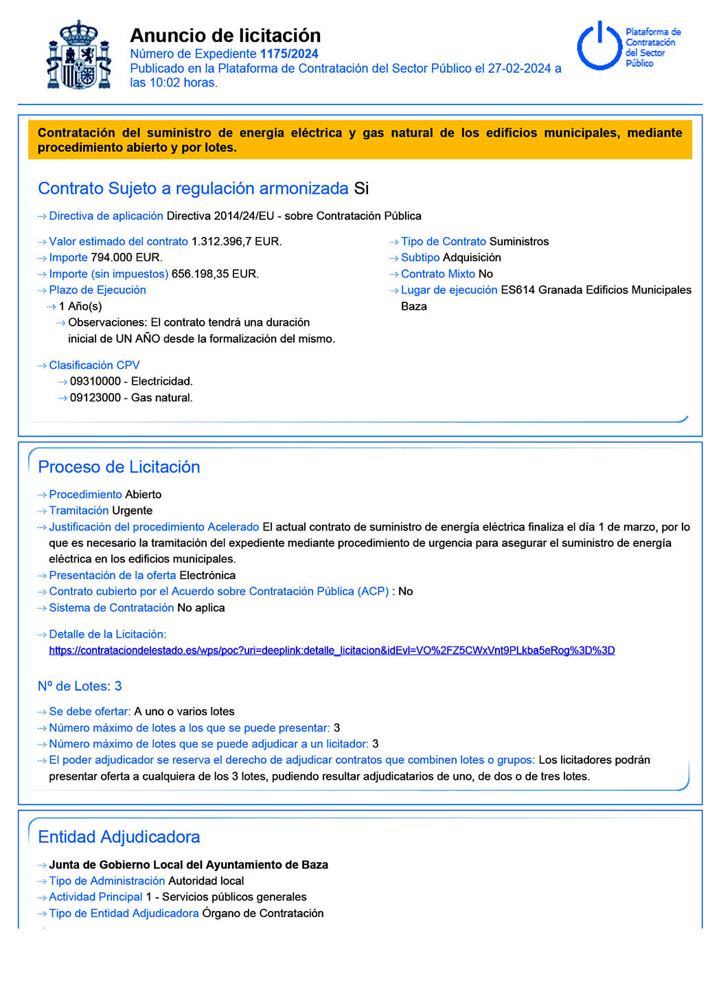 El Ayuntamiento bastetano licita el contrato para el suministro de energía eléctrica y gas natural en los edificios municipales, con plazo para las ofertas hasta el 12 de marzo. La Plataforma de Contratación del Sector Público tiene ya publicado el anuncio de licitación que va a regir la contratación del suministro de energía eléctrica y gas natural de los edificios municipales del Ayuntamiento de Baza, una gestión que se realiza por procedimiento abierto y por lotes.