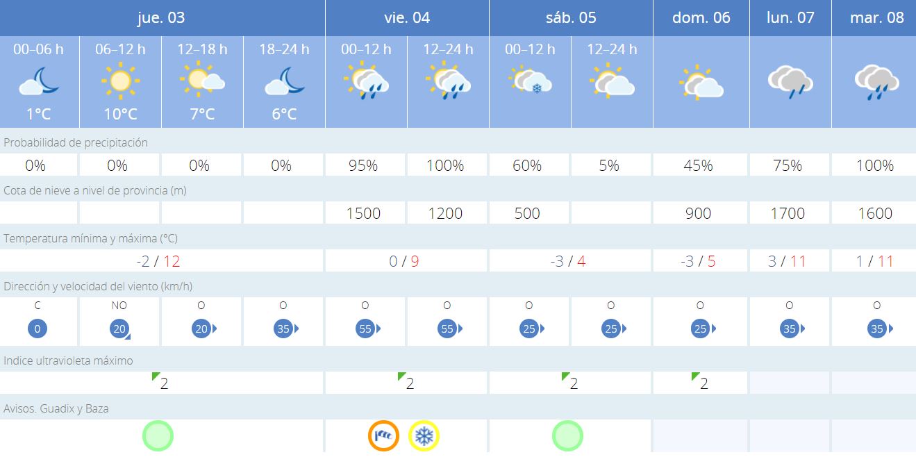 La llegada de una borrasca traerá consigo un temporal con frentes asociados y precipitaciones, que afectarán sobre todo al norte peninsular, con nevadas abundantes en zonas montañosas, que incluso podrían afectar a zonas llanas del interior de la mitad norte. La cota de nieve bajará hasta situarse en los 500-800 metros en la mitad norte y los 800-1200 metros en la mitad sur, una cota que podría traer la nieve a la ciudad de Baza y las localidades de su entorno, junto a un descenso significativo de las temperaturas.