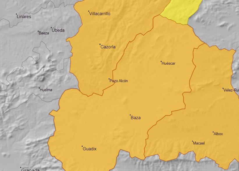 En cuanto a las alertas decretadas por la Agencia Estatal de Meteorología, para la zona de Baza y otras comarcas del norte granadino, se trata de una alerta naranja por viento de hasta 90 km/h, para el viernes 4 y por rachas máximas de hasta 90 km/h, de componente oeste. En cuanto al riesgo de nevadas se ha catalogado de nivel amarillo y una acumulación de 4 cm, en 24 horas, para ese mismo día, desde las tres de la tarde y hasta la mañana del sábado, con una cota, para la que se espera la nieve, de 1100 metros, pero que irá bajando hasta de 700 metros, a últimas horas.