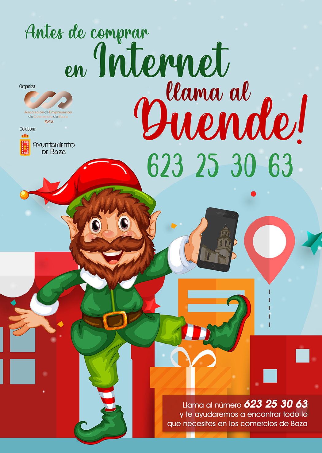 Además, hemos creado la figura de “El Duende”, por la que queremos dar la opción de comprar en Baza antes de que se compre por Internet. El lema es el siguiente, “Antes de comprar por Internet, pregunta al Duende, llama al teléfono 623253063”. Este teléfono estará operativo para que los vecinos puedan pasar sus pantallazos de lo que quieren buscar y se les envíe teléfonos de las tiendas que pueden tener ese producto y en ocasiones, hasta les puede dar el precio final. Además, podrá llevar las compras a domicilio dentro de Baza, para facilitar así las compras que se puedan hacer desde el domicilio, todo esto a coste 0 para el consumidor.
