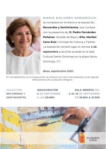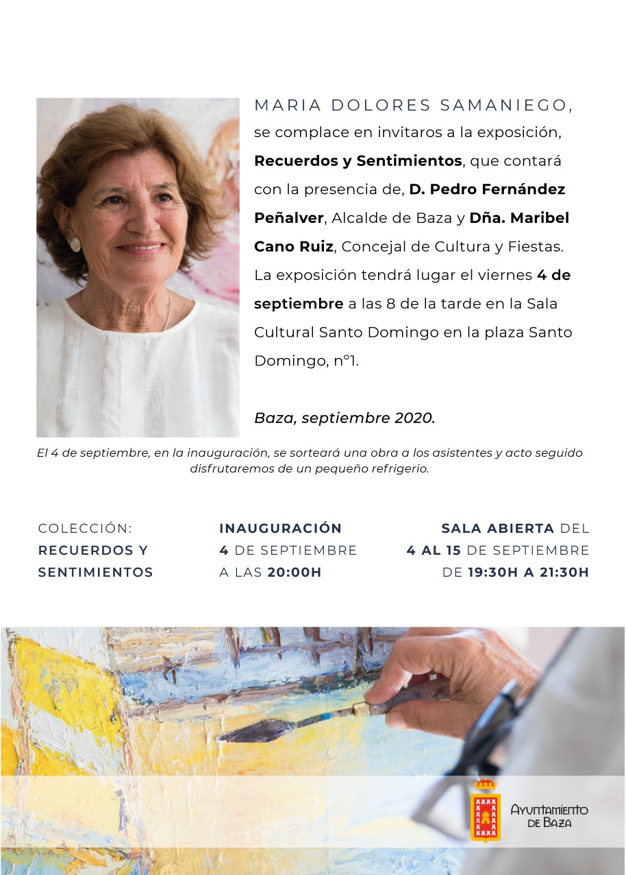 La pintora bastetana Mª Dolores Samaniego presenta mañana, en el Centro Santo Domingo, su exposición “Recuerdos y Sentimientos”. Una bastetana de las que no olvidan a su tierra, pesar de residir a unos cuantos cientos de kilómetros de Baza, la ciudad en la que nació y vivió y en la que tiene gran parte de sus raíces.