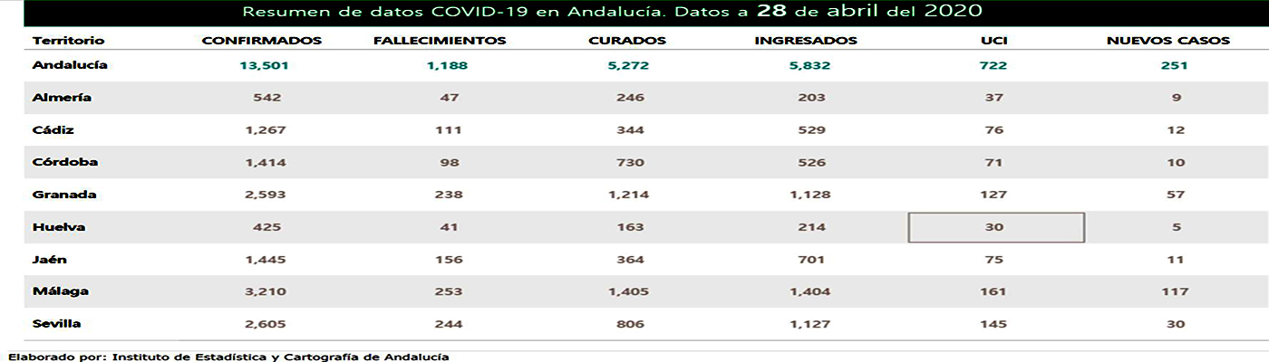 Por su parte, la Consejería de Salud y Familias, en colaboración con el Instituto de Estadística y Cartografía de Andalucía, ofrece sus propias cifras sobre la situación en nuestra Área Sanitaria, ahora sí, en todo su conjunto, referidos al 28 de abril -en los que destaca el aumento en 8 curados, que pasan de 45 a 53-, que son los siguientes:
