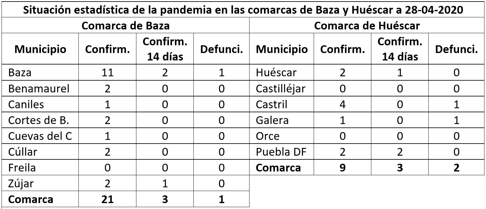 Datos por Municipios de personas contagiadas y fallecidas en las comarcas de Baza y Huéscar a fecha del 28 de abril. Volvemos a recurrir a la nueva información que ha empezado a facilitarse, desde el pasado lunes, en la que se ofrecen datos sobre los municipios de confirmados, confirmados en 14 días y fallecidos, poniendo especial interés en las comarcas de Baza y Huéscar, que es la zona en la que se encuentra la mayoría de lectores de nuestro entorno más próximo, en el que no se han producido variaciones en los dos últimos días.