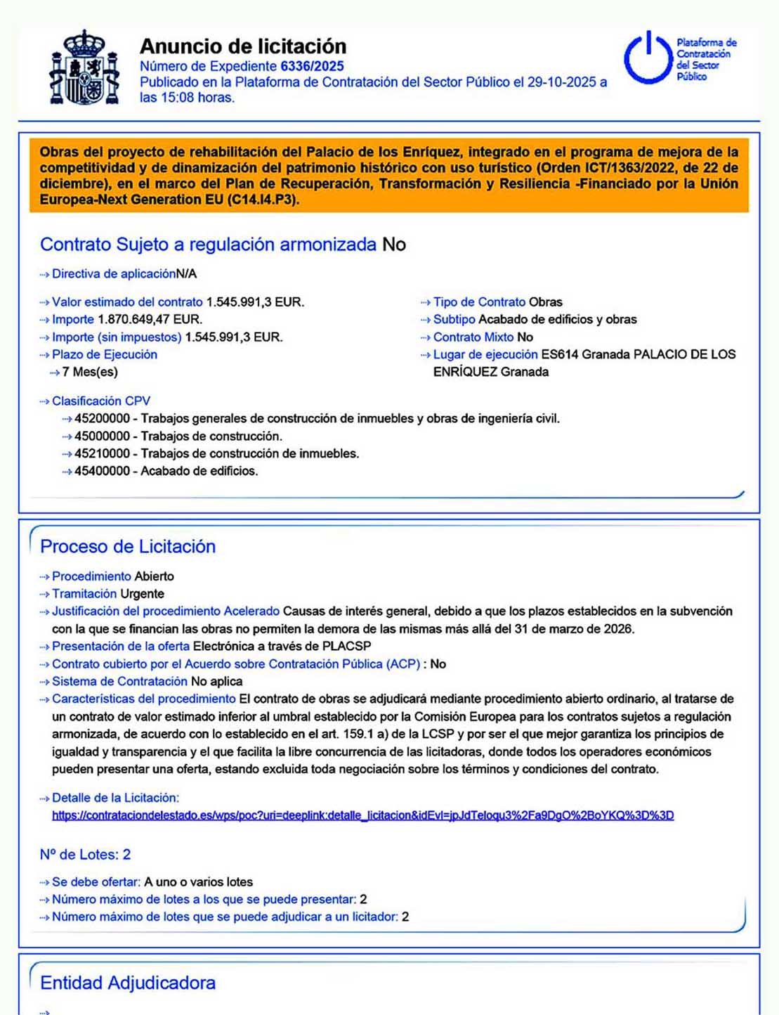El Ayuntamiento de Baza licita nuevamente las obras de rehabilitación del Palacio de los Enríquez, pero estructuradas en dos lotes. El Ayuntamiento de Baza ha publicado en la Plataforma de Contratación del Sector Público el nuevo proceso de licitación para la ejecución de las obras de rehabilitación del Palacio de los Enríquez, uno de los proyectos más esperados por la ciudadanía y de mayor relevancia patrimonial en la ciudad, que retorna a la Plataforma de Contratación del Estado, tras no haber recibido ofertas en su primera licitación ni en la prórroga de la misma.
