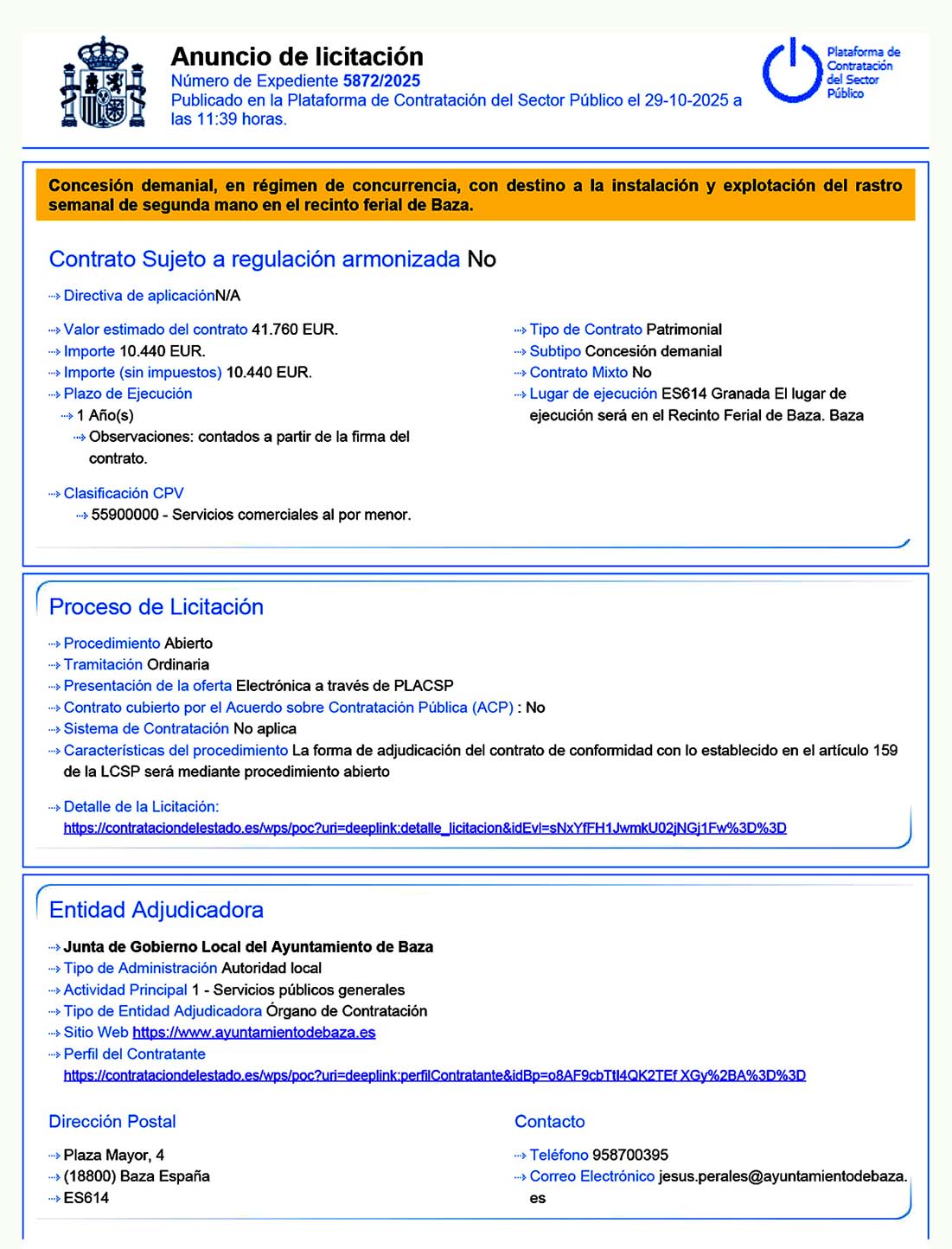 Abierta la licitación para la gestión del rastro semanal de segunda mano en el recinto ferial de Baza. El Ayuntamiento de Baza ha puesto en marcha el proceso de licitación para la instalación y gestión del rastro semanal de artículos de segunda mano, que se ubicará en el recinto ferial de la ciudad. El anuncio ya puede consultarse en la Plataforma de Contratación del Sector Público.