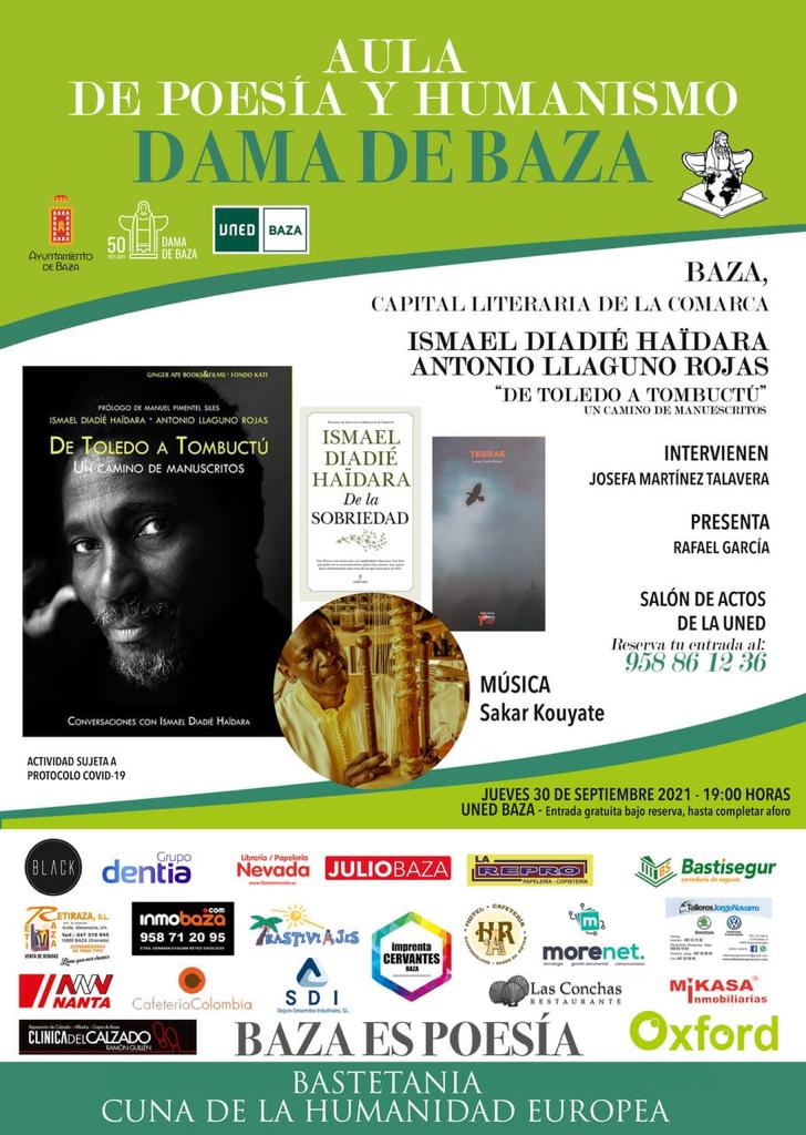“De Toledo a Tombuctú. Un camino de manuscritos”, protagonista en el Aula de Poesía y Humanismo de septiembre. El Aula Municipal de Poesía y Humanismo ‘Dama de Baza’ cuenta este mes de septiembre como invitados con Ismael Diadié Haïdara y Antonio Llaguno Rojas para hablar del libro “De Toledo a Tombuctú. Un camino de manuscritos”.
