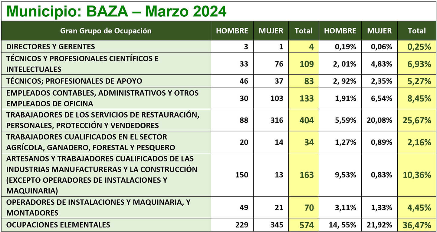 El mes de marzo supone un giro en la tendencia del paro que pasa a ser descendente con 28 parados menos en Baza. Las cifras del paro volvían a mejorar al finalizar el mes de marzo, tras dos meses consecutivos de crecimiento y pasando a totalizar 1.574 personas desempleadas en nuestra ciudad, delos que 648 son hombres y 926 son mujeres, cifras en las que se sigue evidenciando una peor situación en el empleo femenino, algo que se viene arrastrando de forma habitual y que se vuelve a producir en las cifras del último mes, aunque esta vez se ha invertido la tendencia y han sido 9 hombres los que han encontrado empleo, mientras que el empleo femenino ha mejorado para 19 mujeres que encontraron empleo.