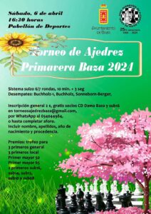 El Pabellón Municipal de Deportes acoge este sábado, 6 de abril, el Torneo de Ajedrez Primavera Baza, a partir de las 16:30 h. El Torneo de Ajedrez Primavera de Baza, organizado por el Club Deportivo de Ajedrez Dama de Baza, con la colaboración del Ayuntamiento, se pone en marcha el próximo sábado, 6 de abril.