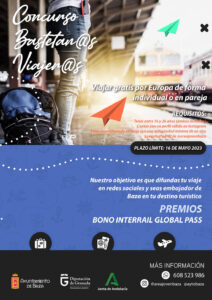 El concurso ‘Bastetan@s Viajer@s’ ofrece a los jóvenes de Baza viajar gratis por Europa. El Ayuntamiento de Baza ofrece a jóvenes de entre 16 y 26 años de la localidad la posibilidad de viajar gratis por Europa, de forma individual o en pareja, gracias al concurso de ámbito local “Bastetan@s Viajer@s”, a desarrollar a través de Internet.