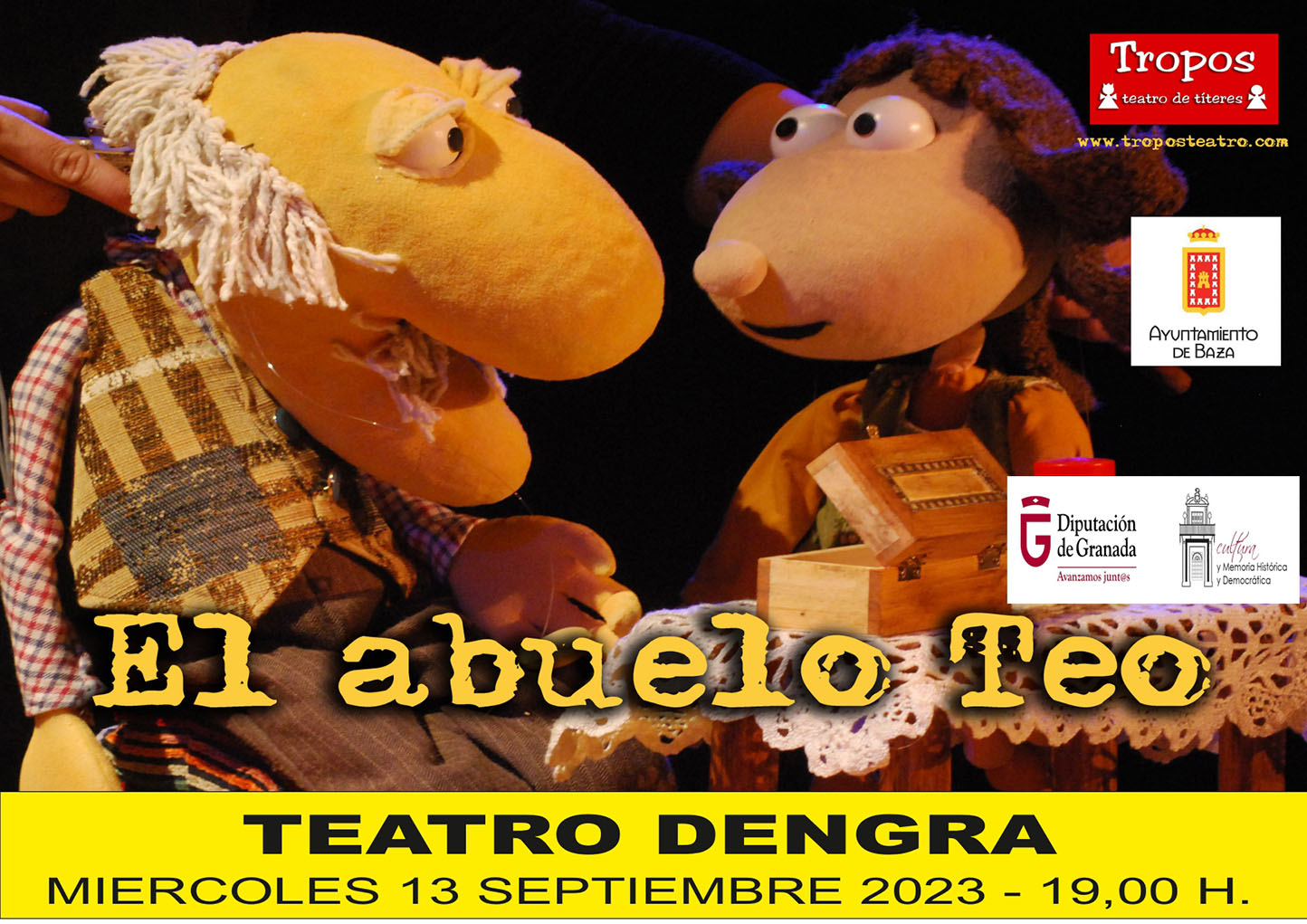 La última de las obras de este ciclo es «El Abuelo Teo» y se representará el 13 de septiembre. El abuelo Teo pasa mucho tiempo con su nieta. Disfruta contándole historias maravillosas de las aventuras que pasó de joven con su inseparable amigo Genaro. Pero también quiere enseñarle todas las cosas que él ha aprendido para que no caigan en el olvido. Así le enseña a jugar al ajedrez, al pañuelo, a las tabas, a portarse bien… ¿Puede irse ya tranquilo? ¡No! Su nieta le hace una última pregunta: «¿Qué es lo importante en la vida?».