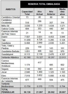 La reserva hídrica española se encuentra al 39 por ciento de su capacidad. Actualmente, la reserva hídrica es de 21.897 hectómetros cúbicos, a 3 de noviembre de 2021 lo que supone un 39,0 por ciento de la capacidad total de la reserva hídrica española.