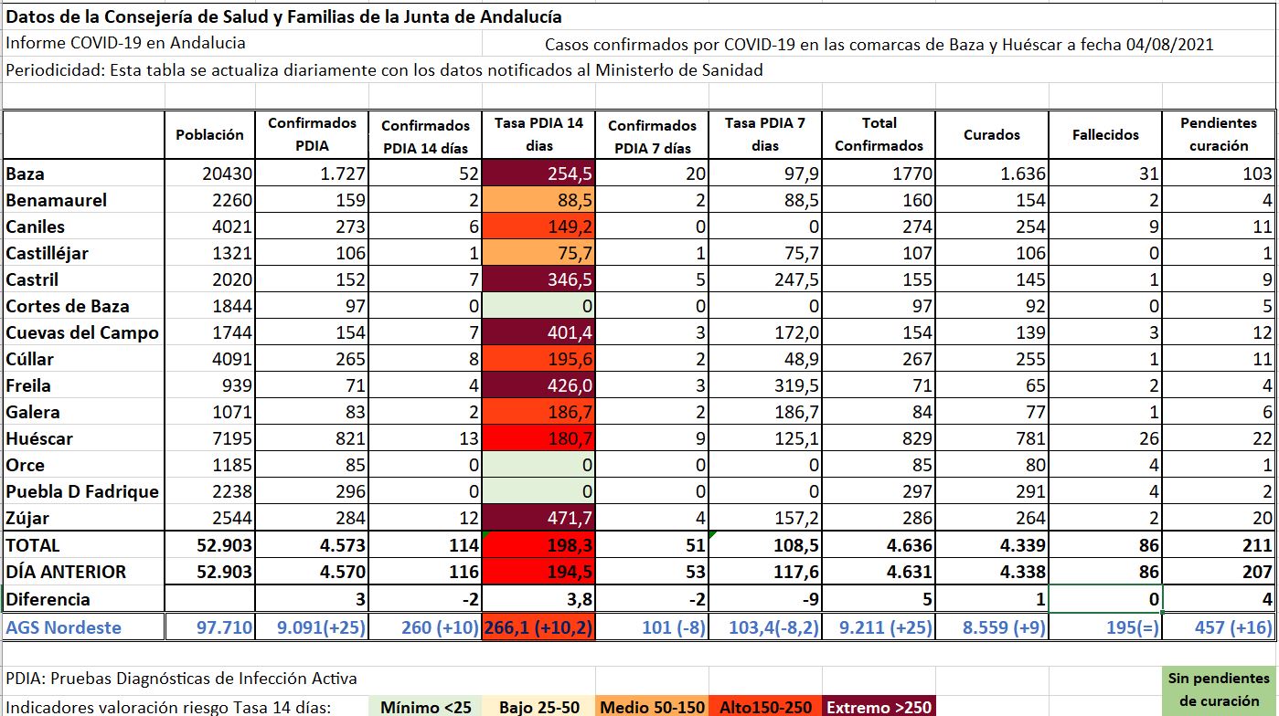 Los nuevos positivos se localizaban 5 en Baza, 2 en Benamaurel y uno en cada una de las siguientes localidades: Castril, Cuevas del Campo, Galera, Huéscar y Zújar. Un dato del que recordamos que no se produce su comunicación con la misma inmediatez que cuando esas cifras nos llegaban desde la sede de la AGS Nordeste de Granada, lo que fue así hasta el pasado 15 de julio.