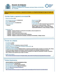 En paralelo, también se ha puesto en marcha la licitación para las obras de reparación estructural del depósito municipal de agua de la Cuesta del Francés. Esta intervención, financiada por la Diputación Provincial de Granada dentro de los Planes Provinciales de Obras y Servicios (PPOYS) 2024-2027, cuenta con un presupuesto base de 139.947,23 euros (IVA incluido).