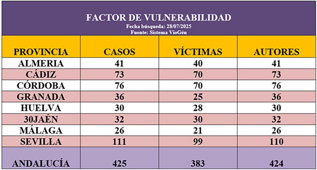 El informe, elaborado por la Unidad de Coordinación contra la Violencia de Género en Andalucía, también revela que 425 casos presentan factores de vulnerabilidad entre las víctimas, como discapacidades, enfermedades graves o antecedentes de intentos de suicidio.