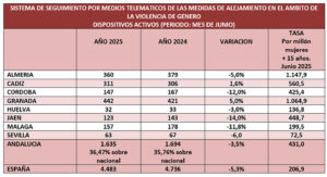 Respecto a las pulseras de alejamiento, en el mes analizado había 1.635 dispositivos activos en la comunidad. Aunque su número descendió respecto a junio de 2024, la tasa por millón de mujeres mayores de 15 años es de 431, más del doble que la media estatal, fijada en 206,9. En total, en España hay 4.483 pulseras activas.